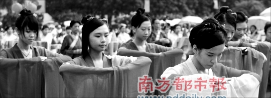 “每走一步、袖子怎么擺動,都有講究。”廣東省民俗文化研究會副秘書長、珠村民俗專家潘劍明是儀式主持,他透露,此次演出專門請來“漢禮”專家按歷史傳統還原場面。