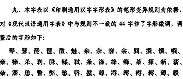 按照這份《通用規范漢字表》,“唇”、“琴”、“親”等44個漢字在專家倡導下進行了寫法調整。如:“琴”字左上角“王”字最后一筆由 “橫”變為了“提”;“唇”字的“廠”字頭由半包圍結構調整成了上下結構,“親”“雜”“殺”等字底下的“豎鉤”改為“豎”,最后一筆由“點”改成 “捺”……漢字“整形”方案一出,立刻遭到網友炮轟,有網友還用調侃的口吻對寫法調整進行了諷刺。如“唇”字由半包圍改成上下結構,網友評論“張揚個性的年代,不用掩口說話”等。