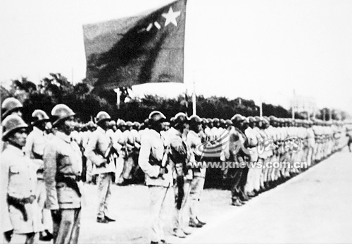 今年10月1日,恰逢建國60周年。每次隆重莊嚴的閱兵儀式,都會成為國慶的重頭戲。60年前,新中國開國大典的閱兵儀式是如何訓練的?當年從江西走出的199師師長、獲得少將稱號的李水清帶領的12個步兵方隊,又是怎樣成為開國大典閱兵式陸軍第一方隊的?17日,江西著名攝影師戴廷耀向記者講述了江西老紅軍李水清當年帶隊在天安門受閱的背后故事。