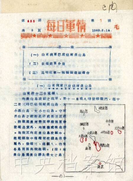 長山列島位于山東半島與遼東半島之間,扼渤海灣門戶,由南、北長山島等17個島嶼組成。山東半島解放后,退據(jù)長山列島的國民黨軍陸戰(zhàn)第2團(tuán)等部,破壞漁業(yè)生產(chǎn)和海上交通,妄圖封鎖渤海灣。1949年8月,中國人民解放軍山東軍區(qū)指揮進(jìn)行解放長山列島的作戰(zhàn)。11日晚,第24軍第72師和警備第4、第5旅分別從蓬萊縣劉家旺、欒家口、解宋營起渡。12日凌晨,警備第4、第5旅攻占長山列島兩翼大小黑山島、大小竹山島,牽制停泊在南北長山島的國民黨軍艦艇。第72師在友鄰配合下,接近南北長山島,并在炮火掩護(hù)下迅速登島,與國民黨守軍展開激戰(zhàn),上午攻占南長山島,下午占領(lǐng)北長山島。爾后以警備第5旅為主,向砣磯島、大小欽島、南北皇城島發(fā)展進(jìn)攻。至20日,國民黨守軍殘部棄島逃遁,人民解放軍收復(fù)了國民黨軍隊(duì)占領(lǐng)的大小島嶼,殲國民黨軍15OO余人,山東省全境解放。