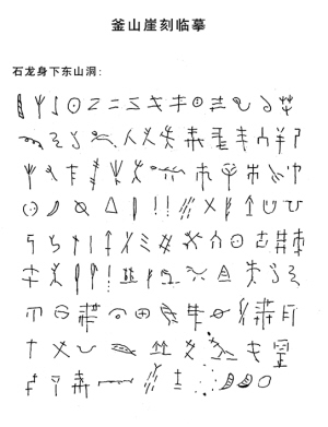 此外,釜山的崖洞內(nèi)還留有109個“古文字”。經(jīng)專家推測,這些“古文字”均為上古黃帝時代人類留下的符號,但其用意和內(nèi)容目前仍然無法破譯。考古人員在研究對比中發(fā)現(xiàn),釜山崖刻和史前出土的刻畫符號有相同的,與早期青銅器上的刻畫符號也有相同的。這說明釜山的摩崖石刻不僅繼承了仰韶時期的特點,同時又發(fā)展到了青銅器時代。這些刻畫符號的上限是公元前5000多年,下限是先商時期,大致相當于黃帝“合符”的年代。