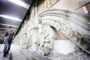 近期關于藝術品進地鐵的話題是隨著北京地鐵4號線的開通而逐漸熱起來的。于9月底通車的北京地鐵4號線在8個重點站設置了裝飾性藝術壁畫,其“記憶歷史文脈,彰顯城市文化,突出地域標志”的設計理念使這些壁畫充滿了人文氣息和歷史厚重感。如國家圖書館站的主題為“書的海洋”,圓明園站的西洋樓殘柱浮雕,西單站的《老字號》浮雕等。可以看出地鐵經營方對引入公共藝術的重視,以及通過藝術品來裝飾地鐵空間,使乘客得到美的熏陶,甚至提高民眾的藝術欣賞水平的愿望。