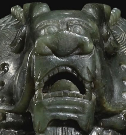 李教授同時指出此次拍賣的“八徵耄念之寶”印龍爪、頭部紋飾雕工疲弱而少章法、刀法。龍的發紋不上沖,火焰紋并不上揚,龍爪粗野乏力、沒有抓力,缺乏動感,似走獸類臥伏在地面一般,龍脊拱沿處造型用,用刀不干凈表現無弧勢,顯出臃腫、毫無生氣,因造型力度沒把握好,鼻部中軸整塊竟不居眼、口正中,電腦圖片放大后看到門牙和邊牙竟上下鋸裂,此應為機雕出了差錯留下的殘缺,龍的形狀與面部表情呈驚恐狀,毫無龍威,粗糙得象磚雕,更無皇家氣象(圖五)。而拍賣玉璽竟煞有介事地配了個底坐“以舊充好”,以示此玉璽大有來歷,作偽者殊不知清宮玉璽多封黃綬帶(配綬帶寓意長壽,也是使用方便),并承之以紫檀木匣。大部分寶匣并加以雕工或描金,以彰顯出玉璽的尊貴與皇家氣象。