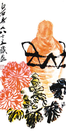 齊白石以花鳥畫見長(zhǎng),他善于將民間藝術(shù)的審美情趣融進(jìn)傳統(tǒng)文人畫,以質(zhì)樸率真之氣開創(chuàng)了文人畫的新境界,畫面洋溢著活潑的生命力,極具明朗、清新之美,充滿了泥土的芳香。技法上,他注重用筆的蒼勁老辣與方折勁挺,筆力雄健,揮寫自如;墨法則講究單純準(zhǔn)確,對(duì)干濕濃淡的搭配關(guān)系極力經(jīng)營(yíng);用色則大膽而濃艷,吸收民間美術(shù)的敷色特點(diǎn),卻艷而不俗;構(gòu)圖上,他多以簡(jiǎn)潔之圖,塑花、鳥稚拙之美,但一些作品則極力刻畫蟬、蝶、蟋蟀等小昆蟲,寫實(shí)程度足可亂真,與大寫意花卉相配,別具情趣。