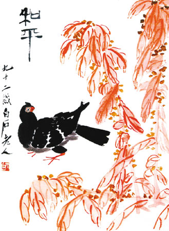 《和平鴿》是一幅以動(dòng)物為主體的上乘之作。齊白石一生對(duì)生活充滿熱愛,其筆下花鳥蟲魚,乃至蟬、蝶、蟋蟀等小昆蟲,皆充滿情趣,寄托和凝聚著他內(nèi)心的天真與童趣。鴿子是白石老人很喜愛的題材,他曾親自飼養(yǎng)鴿子,觀察其體態(tài)神韻,創(chuàng)作態(tài)度嚴(yán)謹(jǐn)。該畫右側(cè)是一叢鮮艷的雁來(lái)紅,兩株并立,一株斜插,枝葉披紛,繁而不亂。在紅花之下,站立著一只通體漆黑、紅嘴紅爪的和平鴿,雙目圓睜,回首眺望,極顯精神。鴿子雖是大寫意畫法,但結(jié)構(gòu)造型精準(zhǔn)。此畫僅黑紅二色,卻營(yíng)造了熱烈而穩(wěn)重的氛圍。題款“和平、九十二歲白石老人”不僅點(diǎn)明主題,而且在全畫以“面”為主的構(gòu)圖中,制造了“點(diǎn)、線”元素,使作品形式更為豐富。