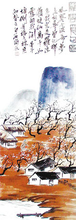 白石老人以花鳥創(chuàng)作為主,但也偶作山水,并能把花鳥畫的一些技法運(yùn)用到山水畫中,別有清新明快之感。《羅浮覓句圖》是一幅精彩的山水畫作品,此作取全景式構(gòu)圖,布局宏大:遠(yuǎn)處羅浮山巍峨聳立,設(shè)色單純明快,虛實(shí)相映,凸顯空間之感;山下赭色的坡地上則是梅林如海,白梅綻放,梅香陣陣;林中屋舍隱顯,高士攜童覓詩(shī);近景水波微瀾,渡頭空曠,具有濃郁的文人情懷。該畫的技法簡(jiǎn)捷,沒有傳統(tǒng)山水畫的“勾、皴、染、點(diǎn)”的繁復(fù)創(chuàng)作程式,而是以大寫意手法縱筆平涂,別具簡(jiǎn)約質(zhì)樸的生活情趣。在色彩上,大片泥土的赭石紅,也與遠(yuǎn)山淺藍(lán)綠的花青色形成鮮明對(duì)比,顯得非常精神。題詩(shī)“風(fēng)寒冬深無(wú)夢(mèng)來(lái),相尋曾記那年栽;定是羅浮舊蜨仙,萬(wàn)千如雪向我開”,詩(shī)畫相配,令人心馳。