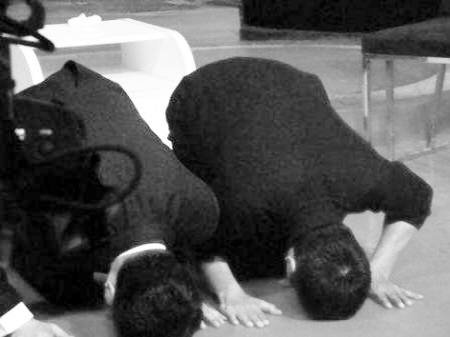 周潤發(突然拉著朱軍,面對現場觀眾跪了下來):讓你感受一下《孔子》是如何復原兩千年前的真實生活的。(接著以額貼地,實實在在地給觀眾叩了一個頭)這個跪拜是謝謝現場的觀眾。