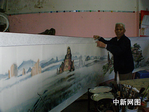 中新網(wǎng)韶關(guān)12月29日電 (馮昶 袁少洪)年近八旬的中國(guó)畫家譚飛彬老先生為支持丹霞申遺而創(chuàng)作的三十米國(guó)畫《丹霞山》,今日完成。