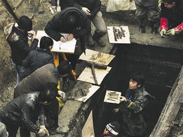 昨日上午10時許,工作人員從槨室內(nèi)的淤泥中清理出幾片器物,吸引了眾人的目光。經(jīng)現(xiàn)場考古專家證實(shí),這是兩枚珍貴的竹簡,由于年代久遠(yuǎn),墓室內(nèi)的結(jié)構(gòu)和環(huán)境又遭破壞,竹簡異常脆弱。工作人員隨即將竹簡嚴(yán)密包裹起來。由于槨室內(nèi)的淤泥和積水較多,竹簡的數(shù)量和簡上文字內(nèi)容尚不得而知。