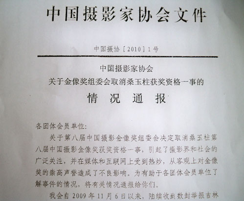 前不久中攝協通過2010年一號文件,在回應攝影金像獎得主桑玉柱涉嫌造假事件時,稱“一些人將矛頭對準金像獎組委會和中國攝影家協會,全盤否定中國攝協近年來在各方面的工作。還有一些人在互聯網上公然借機攻擊黨領導下的文藝界人民團體體制,攻擊黨的文藝方針政策!钡,許林認為文件措辭過分。