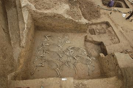 墓室上口長6.2米、寬5米。墓道長15.7米。兩座墓均為南北向,人骨均已散亂,器物箱內都放置鼎、簋、盤、匜、矛等青銅器、車馬器和陶鬲;墓道內均隨葬兩輛馬車和一只狗。墓葬出土玉器10余件,青銅器50余件,其中8件有銘文。在大墓與祭壇之間發現5座馬坑和1座車馬坑。馬坑僅有馬骨架,其中一座殉馬2匹;兩座殉馬各8匹,分兩排整齊擺放;兩座殉馬各6匹,其一分兩排擺放,前2后4,另一座為兩兩成對放置,頭向不一,中間放置一件牛角。車馬坑長14米,寬3.4米。內置3輛車,前兩輛皆四駕,后一輛兩駕。馬頭上均有精美的青銅和串貝飾件。因天氣和水位過高,現正在對車馬坑進行整體提取,移至室內清理。