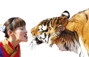 晁改敏被蘇州人熟悉,是在去年11月。那時(shí),她所在的馬戲團(tuán)與蘇州白象灣景區(qū)正式簽約,她和丈夫也告別了各地流動(dòng)演出的生活,帶著英雄虎爸虎媽和它們的兩只虎寶寶,在蘇州暫時(shí)定居。白象灣景區(qū)開園的時(shí)候,晁改敏表演了叼肉喂虎節(jié)目,此前她曾因此節(jié)目,被譽(yù)為中國第一馴虎女郎。當(dāng)她叼著肉,老虎從她的嘴邊把肉吞下時(shí),她的口與虎口近乎零距離。此后,游人多的時(shí)候,晁改敏總會(huì)表演這一節(jié)目,晁改敏也因此在蘇州名氣響亮。