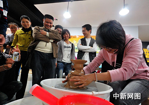 制作現(xiàn)場上,優(yōu)美動(dòng)聽的古箏樂曲不停地繚繞盈耳,瓷藝家們或捏或雕,或刻或鏤,或推或接,各種傳統(tǒng)技法紛紛上陣,精彩紛呈。這行云流水般的手法、精妙細(xì)致的做工、別出心裁的設(shè)計(jì),讓參觀者看得眼花繚亂,贊嘆不已,為之折服。人們?nèi)滩蛔∩锨懊幻?xì)膩的瓷泥,轉(zhuǎn)一轉(zhuǎn)工作盤,拿一拿精致的制作工具。前來參觀的顏小姐不禁挽起袖子也親身體驗(yàn)了一回手拉坯。在轉(zhuǎn)盤的帶動(dòng)下,顏小姐雙手輕拉瓷泥,那團(tuán)柔軟的瓷泥仿佛有了靈性一般“舞蹈”起來,一會(huì)變成一個(gè)款嘴的大海碗,一會(huì)又變成一個(gè)細(xì)腰的小花瓶。舉著滿手的瓷泥,顏小姐開心地說:“太有意思了,讓我想起小時(shí)候玩泥巴的情景!彼表示:“下次有空的時(shí)候,我一定還要再來玩手拉坯,DIY一件作品做紀(jì)念。”