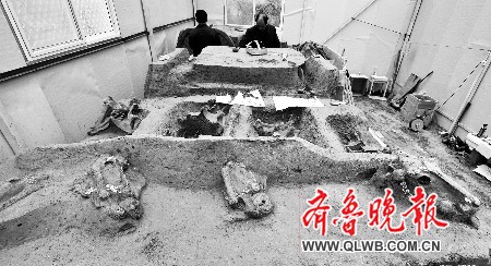 省文物考古研究所所長鄭同修介紹,車馬坑及馬坑等重要遺跡整體起取至濟(jì)南后,就采取了初步的防護(hù)措施,建設(shè)了臨時(shí)保護(hù)和工作用房,制定了保護(hù)工作方案。