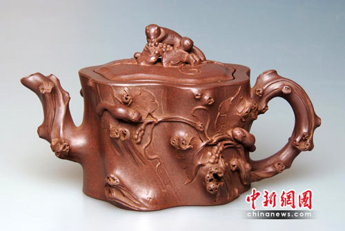 宜興紫砂與“世博”淵源頗深,歷史上曾多次參加世界性博覽會并獲大獎。記者現場看到,在歷屆國際性展覽中獲獎的6件珍品在展廳內光彩耀目,其中在1910年“第一次南洋勸業會”上獲金獎的范大生“大柿子壺”、1915年美國巴拿馬國際賽會獲金獎的程壽珍“掇球壺”、1926年美國費城藝術博覽會獲金質獎的馮桂林“松鼠葡萄壺”等珍品引來眾多文化藝術界人士爭相一睹芳容。