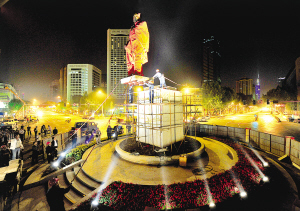 22:30,淮海路、洪武路、王府大街、長江路組成的新街口四環實施交通管制,新街口大轉盤馬上“清凈”下來。22:35,工作人員開始做吊裝前的準備工作,首先是兩臺吊裝機駛近大轉盤南北向停放,緊接著工作人員將銅像下的原有基座切割掉后,吊機開始起吊銅像,為了平衡銅像,在銅像的四邊,都有人用繩子進行牽拉,大約23:50銅像吊裝到基座上,工人開始對銅像進行固定……截至記者發稿時,銅像仍在安放中。