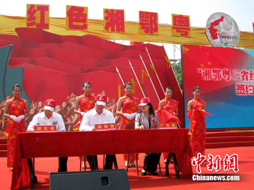 全國政協原副主席毛致用宣布2010年中國(湖南)紅色旅游文化節開幕式啟動。在啟動儀式上,湘鄂粵三省旅游局共同簽署《湘鄂粵三省紅色旅游聯盟》協議,緊扣“市場互推、線路互動、游客互送”三大主題,借武廣高鐵為“媒”共同打造紅色旅游品牌。