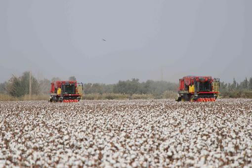 新疆巴音郭楞蒙古自治州尉犁縣一處棉田內,大型采棉機正在作業。茍繼鵬攝