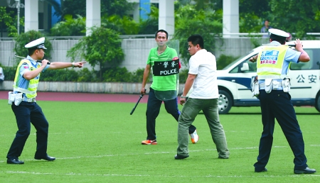 15時(shí)07分,一輛警車開(kāi)進(jìn)操場(chǎng),8名全副武裝的飛龍突擊隊(duì)員跳下車門,迅速包圍操場(chǎng)中央圓弧。他們身穿多功能戰(zhàn)術(shù)背心,頭戴防彈頭盔,手握沖鋒槍,大腿外側(cè)還佩戴著手槍。“放下兇器”,一名突擊隊(duì)員通過(guò)擴(kuò)音設(shè)備兩次喊話,但兩名持刀男子拒不就擒。