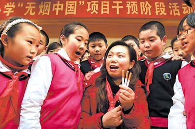 珊瑚實(shí)驗(yàn)小學(xué)規(guī)定,任何人在教室、走廊、辦公室、操場(chǎng)、廁所等公共場(chǎng)所都不得吸煙,校領(lǐng)導(dǎo)當(dāng)場(chǎng)賦予全校數(shù)千學(xué)生監(jiān)督員的權(quán)力,若發(fā)現(xiàn)老師有違反規(guī)定的吸煙行為,都可直接向校長(zhǎng)公開電話舉報(bào)。違反規(guī)定的吸煙老師,將受到扣發(fā)獎(jiǎng)金、影響班組評(píng)先進(jìn)等處罰。同時(shí),珊瑚實(shí)驗(yàn)小學(xué)專門開辟了一間“吸煙室”,防止學(xué)生受被動(dòng)吸煙危害。