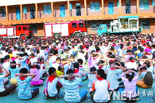 “發(fā)生地震了,如果來不及跑出教室,就立即躲到桌子下面或抱頭蹲到承重墻下,等短暫的地震過后,再迅速撤離教室。如果在衛(wèi)生間內要找墻角抱頭蹲下!毙W生們在消防官兵指導下,都作出同樣動作,在操場演練地震時逃生技能。“以前不知道地震是什么樣的威力,四川地震以后我們學校老師也講了關于地震的好幾次課!彼哪昙壍啮┱f,她學會了“抱頭在桌子或者承重墻下面蹲下”的避震知識,回家要告訴爸爸媽媽。