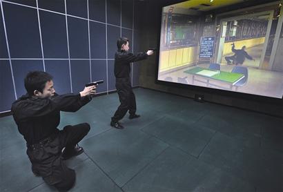 射擊訓練中心的實戰模擬射擊室更有現場感。屏幕上,兩名持槍劫匪突然出現在某銀行營業部,接到報警后,警察將現場包圍,對峙談判無果后,歹徒舉槍射擊,面向屏幕的教官涂明焰和王強同時開槍,兩名歹徒應聲倒地,任務成功!“這是無線電波覆蓋區,訓練者的任何動作都反映在屏幕內。”涂明焰介紹。據了解,控制中心有上千個不同犯罪模擬場景,同一現場中,歹徒可能持刀,可能持槍,也可能投降,現場民警必須根據具體情況,選擇是喊話勸降,是使用胡椒噴霧器、警棍,還是開槍射擊。
