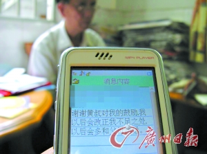 本報(bào)訊 (記者曾毅攝影報(bào)道) 今年74歲,曾任順德區(qū)人大代表的黃其廠老人,昨天終于等來了一條期盼多日的短信,“謝謝黃叔對我的鼓勵,我以后會改正我不足之處,以后多和父母溝通!