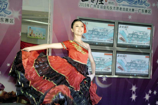 “卡丹路亞運天使·廣州2010年亞運會禮儀志愿者選拔大賽”廣東賽區(qū)的首場晉級賽9月13日下午在廣州展開。廣州分賽區(qū)500多位報名參賽者中通過初步篩選的前30名選手,經(jīng)過一番現(xiàn)場比拼后,最終有20名晉級廣東賽區(qū)“百強”。
