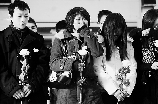 遺體告別儀式開始了。大家朝楊濟(jì)源三鞠躬后,紛紛獻(xiàn)上了白菊花,一直強(qiáng)忍著悲痛的楊媽媽再也支持不住了,好幾次沖到濟(jì)源身邊,想再摸摸兒子的臉龐。