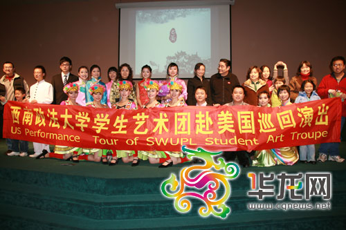 1月23日至2月6日,由西南政法大學15位表演學生、5位老師組成的學生藝術團赴美巡演。在12天的行程里,他們輾轉美國4個州6個城市,在蒙大拿、科羅拉多、南卡羅萊納和俄亥俄等州的孔子學院及孔子課堂,共進行5場演出。約有3000多名觀眾觀看了演出,每場演出都受到了觀眾們的熱烈歡迎。