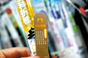 “這款狀元筆買的人很多,大家都希望能高中狀元,上次一個家長就買了10支”。昨天下午,省城長江路上一家文具店內(nèi)店家向顧客介紹。記者抽取了一款外包裝印有“登科折桂”字樣的中性筆筆芯,打開后里面竟然還附帶一張小卡片,卡片上寫有“上上簽”、“天壇祈福”等大吉大利的語句(如圖)。店家王女士告訴記者,這種“討彩”文具是今年才大量出現(xiàn)的,賣得非常好,有的學(xué)生和家長還專門前來購買。“其實(shí)大家也都是種心理暗示,圖個吉利,商家正好抓住了消費(fèi)者的心理”王女士說。