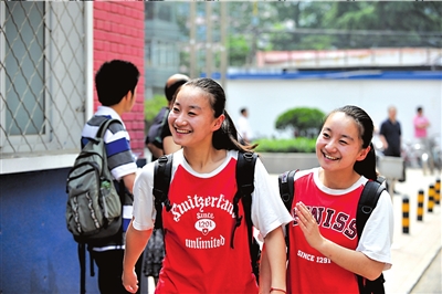姐妹倆都是中關村中學的學生,姐姐叫王裔文,妹妹叫王裔靜。昨天姐妹倆一起出現在北大附中門口,接送的父母遠遠離開。和其他女生不一樣,姐妹倆走起路來虎虎生風,有點假小子的英氣。對于頻頻參加重大比賽的姐妹倆來說,似乎更能適應高考的壓力。她們在校門口興奮地和老師、同學們擊掌打氣,王裔文的班主任開玩笑地后退一步:“你的掌力那么大,我可吃不消。”