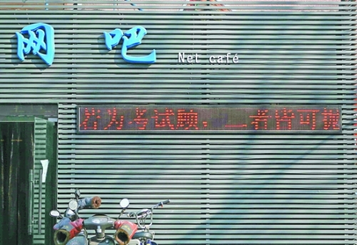 “聊天誠(chéng)可貴,游戲價(jià)更高,若為考試故,兩者皆可拋。”這首改編自裴多菲名句的打油詩(shī),在臨近期末考試時(shí),“登”上了舟山東路旁一家網(wǎng)吧門(mén)口的滾動(dòng)顯示屏,不過(guò)網(wǎng)吧不小心把“故”錯(cuò)寫(xiě)成了“顧”。這幾天,有些學(xué)生考完打算回家,網(wǎng)吧老板同步又打出“祝同學(xué)們合家快樂(lè),虎年虎虎生威”的字樣,“歡送”學(xué)生返家過(guò)年。 周瑾 葉玉躍 李翔 攝