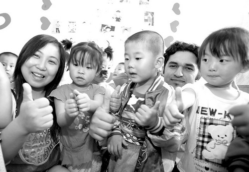 家住張家口橋東區(qū)的李曉霞從北京第二外國語學(xué)院畢業(yè)后,回鄉(xiāng)創(chuàng)業(yè)創(chuàng)建了“新東方幼兒園”,她既要面對(duì)家庭的重負(fù)和經(jīng)濟(jì)上的壓力,又要不斷提高創(chuàng)業(yè)的素質(zhì)和能力。在橋東區(qū)政府和婦聯(lián)的幫助下,如今她已成為擁有90多名兒童和十幾位教師的、在當(dāng)?shù)仡H具特色的雙語幼兒園的成功創(chuàng)業(yè)者。這是李曉霞(左一)和來自巴基斯坦的外教在教孩子們學(xué)唱英文歌。