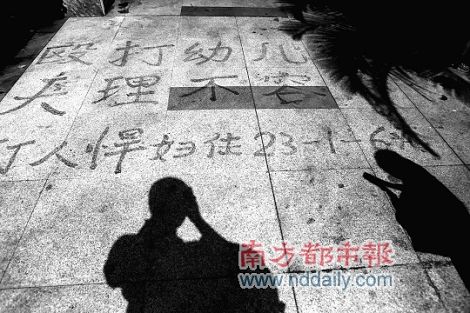 好事不出門,壞事傳千里。就是那沉重的一記耳光,蔣某成了小區(qū)“名人”,她所居住的23棟也成了鄰里關(guān)注的焦點。在該單位門口地上,一幅揮墨如潑的“書法”格外引人矚目,“毆打幼兒 天理不容 打人悍婦住23-1-××”,鄰居透露此乃被打男童蒙蒙(化名)爺爺?shù)慕茏鳌?/p>
