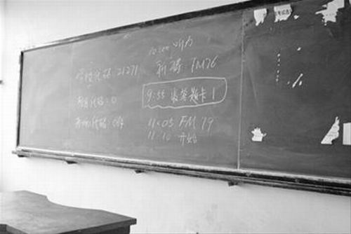 記者在第二教學(xué)樓208教室的黑板上看到兩個顏色書寫的內(nèi)容,白色粉筆寫著“聽力10:00 FM76”,黃色粉筆寫著“11:05 FM79”。
