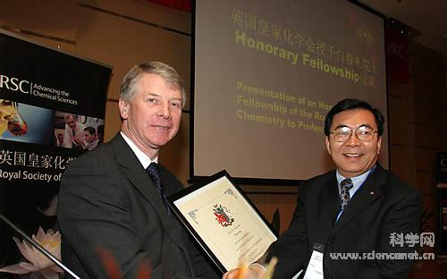 中新網12月14日電 據中國科學院網站消息,12月12日,英國皇家化學會授予中國科學院院士白春禮榮譽會士(Honorary Fellow)儀式暨首屆英國《化學通訊》國際學術研討會在北京隆重舉行。目前,全球僅有87位杰出人士獲此殊榮,其中僅有三人來自亞洲,白春禮院士則是獲此殊榮的第一位中國人。來自教育部、中國科學院、國家自然科學基金委員會、北京大學、清華大學等單位的代表出席了此次研討會,共同見證了白春禮院士榮獲英國皇家化學會榮譽會士的激動時刻。