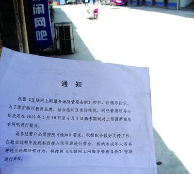 5月30日,有網(wǎng)友在天涯社區(qū)發(fā)帖稱,5月25日山西臨縣網(wǎng)吧協(xié)會貼出了網(wǎng)吧關閉的公告:“有關部門要求網(wǎng)吧停業(yè),具體何時開放另行通知。”該網(wǎng)友稱據(jù)傳是因為即將到來的高考而強制關閉了該縣城所有網(wǎng)吧,“全縣所有的網(wǎng)吧都在劫難逃,光纜被停,只能用電話線上網(wǎng)。”