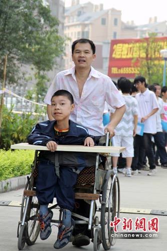 中新網(wǎng)宜昌6月20日電(記者 劉良偉 上官純青)20日,湖北宜昌7.7萬(wàn)名學(xué)子參加了當(dāng)?shù)氐闹锌,這其中有一位特殊的孩子——宜昌市十五中905班的王宇,在父親的陪伴下,來(lái)到當(dāng)?shù)貙iT(mén)設(shè)立的特殊考生考場(chǎng)參加了考試。十多年來(lái),父親王忠(化名)為患有罕見(jiàn)的肌肉營(yíng)養(yǎng)不良癥的王宇,和妻子沒(méi)有放棄,用人間真愛(ài)一路陪伴著兒子,無(wú)論風(fēng)吹雨淋,他都執(zhí)著地背孩子上學(xué),并自己鉆研醫(yī)學(xué),以身試藥,用真心真愛(ài)演繹著平凡人生里不朽的傳奇。