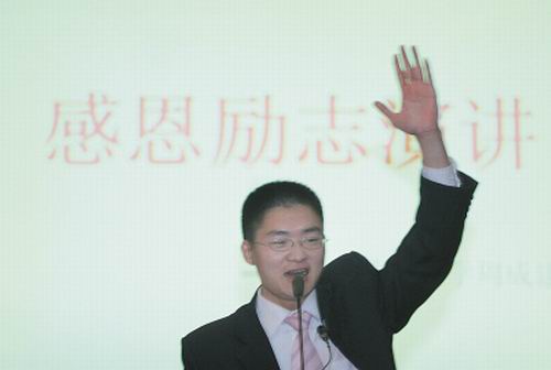 昨日下午4點,記者在重慶八中禮堂見到了正在做勵志演講的西政經(jīng)貿(mào)法學(xué)大四學(xué)生周成建。演講臺上,周把自己的人生經(jīng)歷、奮斗經(jīng)歷編織成故事講給中學(xué)生聽。