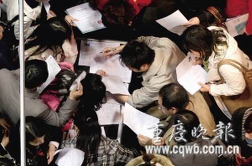 沙坪壩區人才市場舉行房地產開發類專場招聘,結果進場的大型知名地產開發企業為零,一個售樓員職位,上百人搶。