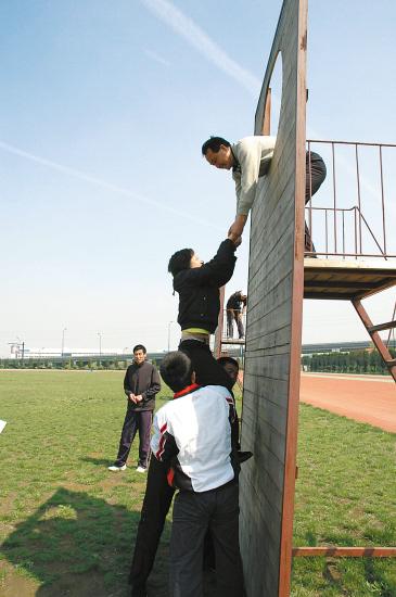 翻越營(yíng)救墻項(xiàng)目,模擬前有高墻、后有追兵的情境,每個(gè)人都必須翻越過(guò)3米高的求生墻,大家必須相互協(xié)作,一個(gè)先上到墻頂,負(fù)責(zé)拉下面的人,有的還要負(fù)責(zé)擔(dān)當(dāng)“人梯”。