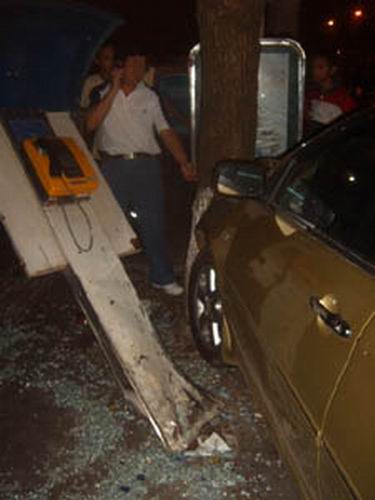 16日下午6時(shí)許,記者趕到車禍現(xiàn)場(chǎng)看到,一輛金黃色豐田車停在瓊山中學(xué)門口右側(cè)人行道上大樹旁,車頭有明顯的撞痕。大樹旁“躺”著一個(gè)公用電話亭,地上到處是玻璃碎片。