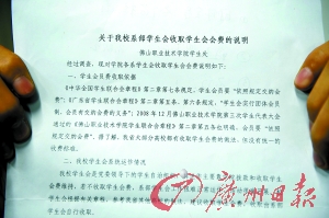 記者調(diào)查了解到,佛山職業(yè)技術(shù)學(xué)院是佛山的一所大專院校,共有十幾個(gè)專業(yè),三年制,全校共有3000多名學(xué)生。從2007年年底,該學(xué)院的學(xué)生會(huì)要求全校學(xué)生交納學(xué)生會(huì)會(huì)費(fèi),開始時(shí)是每年交一次,一次交20 元,后來改成一次性交齊60元。三個(gè)年級(jí)三年下來收費(fèi)將達(dá)18萬元。
