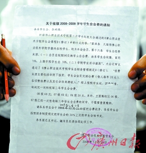 記者從該學(xué)校學(xué)生會(huì)2008年12月15日下發(fā)的一份蓋有公章的《關(guān)于收取2008~2009學(xué)年學(xué)生會(huì)會(huì)費(fèi)的通知》上看到,收取會(huì)費(fèi)的根據(jù)是佛山職業(yè)技術(shù)學(xué)院第三次學(xué)生代表大會(huì)通過的《佛山職業(yè)技術(shù)學(xué)院學(xué)生會(huì)章程》(修改)中的有關(guān)內(nèi)容,“凡取得佛山職業(yè)技術(shù)學(xué)院學(xué)籍的在校學(xué)生,均為本會(huì)會(huì)員”、“學(xué)生會(huì)經(jīng)費(fèi)來源,會(huì)員在校期間交納學(xué)生會(huì)會(huì)費(fèi)(每人每年20 元),由系學(xué)生會(huì)收繳,留用70%,上繳學(xué)院學(xué)生會(huì)30%。”