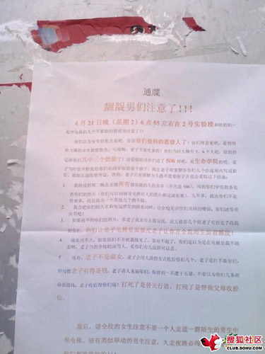 在學(xué)校內(nèi)貼出告示的女生也參與了網(wǎng)絡(luò)回應(yīng),她發(fā)帖表示,自己完全沒(méi)料到此事會(huì)鬧得這么大。只是當(dāng)時(shí)的情形讓她肯定幾個(gè)男生在“耍”她。之后本想找他們說(shuō)清楚,可惜沒(méi)找到人,也沒(méi)辦法聯(lián)系。回寢室后越來(lái)越氣,就在沖動(dòng)下寫(xiě)了那個(gè)告示,“很抱歉我做出了如此不理智的行為,對(duì)于你們名譽(yù)造成的傷害非常抱歉。其實(shí)我根本沒(méi)想真的怎樣,只是嚇嚇(你們)而已,因?yàn)榇_實(shí)是誤會(huì)了。”