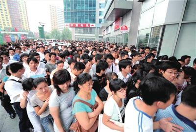 昨天上午9點30分,朝陽人才市場的門前就排起了長隊。該市場舉辦的多為專場招聘會,平時求職者最多也就2000人左右,像昨天一下子來了5000多人顯然超出了市場的承載能力。為了保障安全,主辦方不得不采取臨時控制人流的措施,每隔10分鐘放行30人入場。當天,用人單位提供的崗位只有500余個,供求比高達10∶1,職位競爭非常激烈。由于人多,原本在下午1點鐘結束的首場招聘會被延至5點。