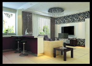 此方案為一居室戶型,該戶型的居住人群多為年輕人,因此方案為現代簡約風格。將廚房完全敞開,與客廳連在一起,采用島臺的餐桌既節省空間,又時尚大方,使用水晶簾將沙發與廚房隔開,具有通透性。在顏色上采用米黃色的墻面,與黑白搭配的壁紙和紅色烤漆櫥柜結合,時尚感極強。(盧柳兆)