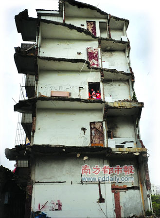 與租客不同,屋主比較擔(dān)心自身安全問題。“平時(shí)不起風(fēng)還好,一起風(fēng)我們就有些害怕。”屋主稱,他們一家三代6口人都住在這里,每次臺(tái)風(fēng)來臨滿樓都是大風(fēng),有一次甚至嚇得兒媳婦跑到賓館開房睡覺。屋主稱,這棟房屋是自己與表弟在1993年修建的,占地面積約有160多平方米,兩家各占一半。幾年前寶地康泰房產(chǎn)公司改造紅山村,表弟與開發(fā)商達(dá)成協(xié)議后搬走,自家卻沒能與對(duì)方談妥。去年6月6日,開發(fā)商將屬于表弟的那一半拆除掉,才出現(xiàn)如此的“半邊樓”。