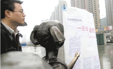 昨日10時(shí),在金水路與未來(lái)路交叉口,一男子拿著一個(gè)上寫“因地暖質(zhì)量問(wèn)題,一元錢拍賣個(gè)人房產(chǎn)”字樣的牌子站在雨中,引來(lái)不少市民觀看。